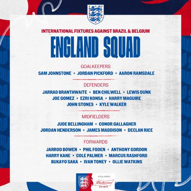 英格兰队公布新一期大名单:贝林厄姆领衔戈登在列