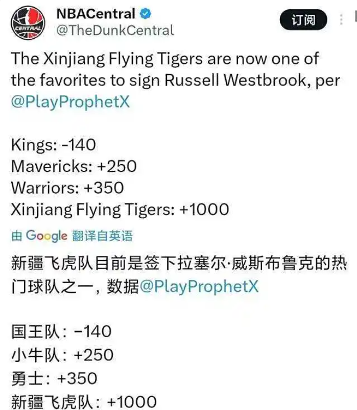 CBA新赛季每个球队外援工资帽高达425万美元,新疆男篮现在还没有引入给力外援。如果新疆男篮真愿意报价300万美元,非常喜欢中国和中国球迷的威少说不定真的会来CBA闯荡一番,而且威少来CBA还能开发自身的商业价值。36岁的威少油箱里还有不少油,新疆男篮1号位刚好缺少一位“三双王”,新疆男篮在补充一些射手,搭配齐麟和沙拉木还真有机会去冲击冠军。